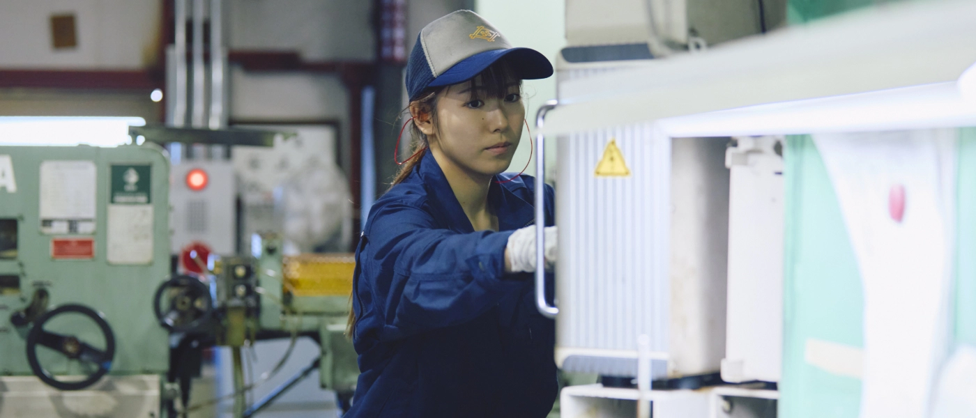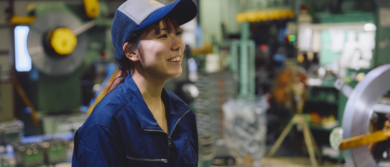 製造現場で働く女性社員の姿に憧れて入社。現在は自動車部品の製造を担当している。安全と正確さを心がけながら業務に励み、和やかな雰囲気の職場で日々成長中。休日はショッピングや映画、編み物など趣味を楽しみ、仕事とプライベートの両立を大切にしている。