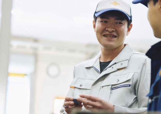 自分の作る製品が社会の役に立つ喜び 私は自動車部品の製造を担当しています。自分が携わった製品がどのように使われているのか知ったとき、社会の一部を支えていることを実感し、大きなやりがいを感じました。また、金型メンテナンス後に寸法不良が発生した際には、原因を丁寧に探り、周囲に相談しながら改善に取り組みました。試行錯誤の末に問題を解決できたとき、自身の成長を感じることができました。